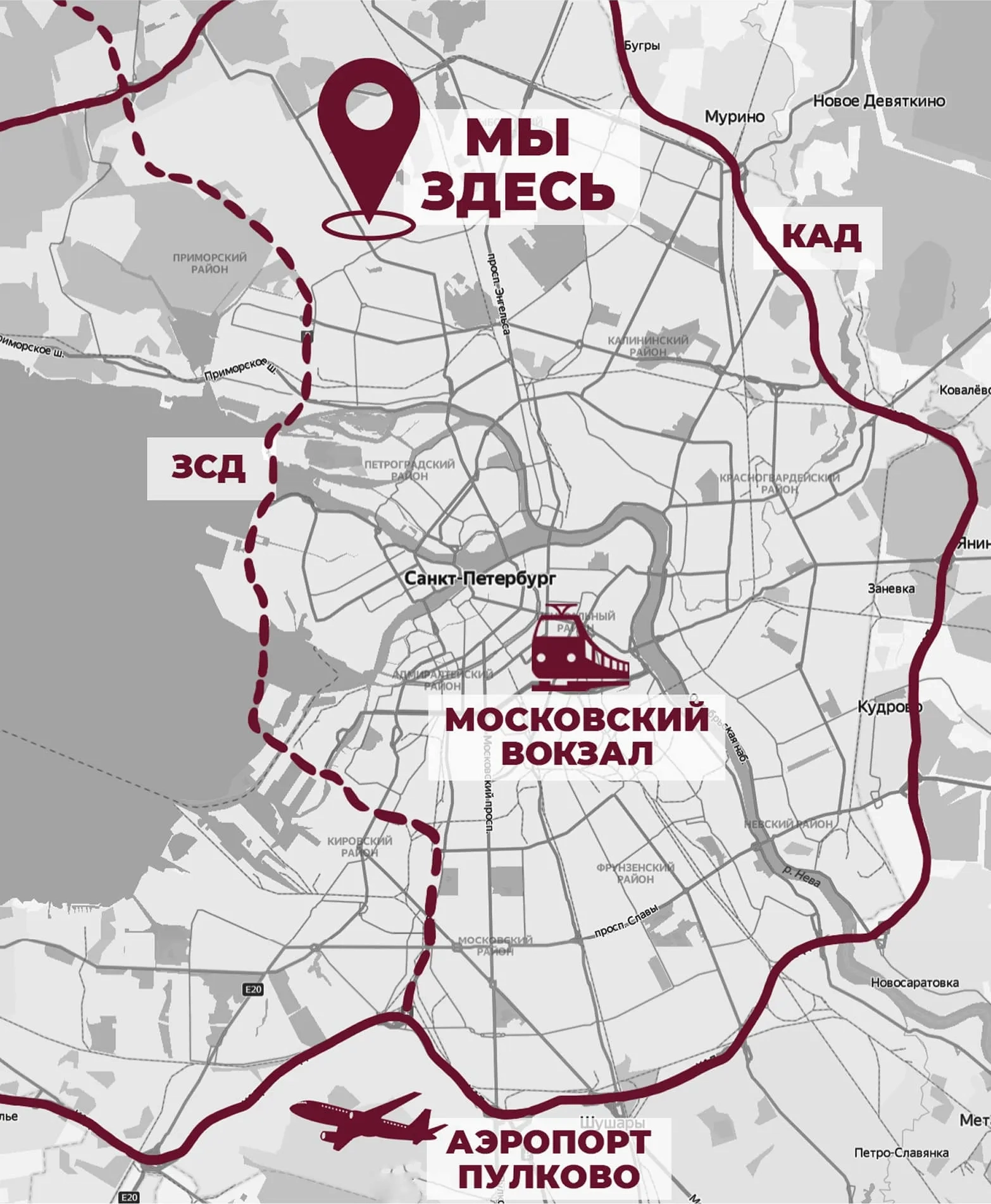 В непосредственной близости от Business Hub находятся выезды на все важные магистрали Приморского района, КАД, ЗСД, соседних районов. Легкий доступ к зданию обеспечен как автомобилистам, так и велосипедистам, и пешеходам. Все виды транспорта доступны сотрудникам и гостям комплекса Business Hub.